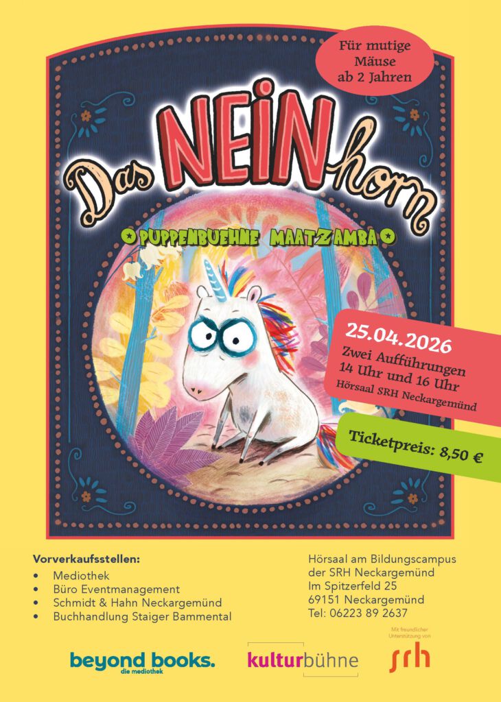 Karten können im Vorverkauf bei der Buchhandlung Schmitt & Hahn Neckargemünd, Buchhandlung Steiger in Bammental, dem Büro Eventmanagement der SRH Neckargemünd, der Mediothek in Neckargemünd und über eventim gebucht werden – einfach hier klicken.